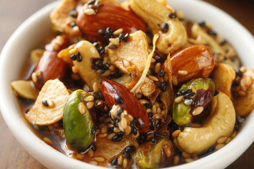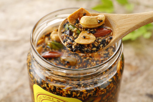 品名:食べるラー油 原材料:食用ごま油、アーモンド、ゴマ、カシューナッツ、ピスタチオ、フライドガーリック、フライドオニオン、赤唐辛子 内容量:400g 賞味期限:製造日より6ヵ月 保存方法:直射日光、高温多湿を避けて保存してください。