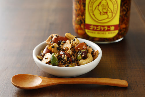 存在感たっぷりのゴリゴリ入ったナッツが決め手!食べ応えも旨味も他とは違う「進化系・食べるラー油」。香り引き立つ純正ごま油100%使用。8年かけ徹底的に追求した黄金比率、香り、味、食感。大容量の400g。しかも安心安全の化学調味料、着色料、保存料無添加。食塩も無添加ですので、色々な料理に合わせることが出来ます!ゴリゴリ食べれば、きっとあなたもゴリラー。